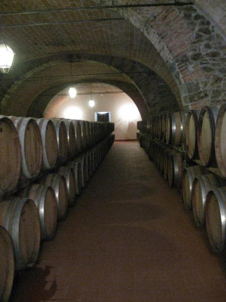 wet, floor, barrels, line, stacked, wine, building, lights, arch, stone, wall, brick,