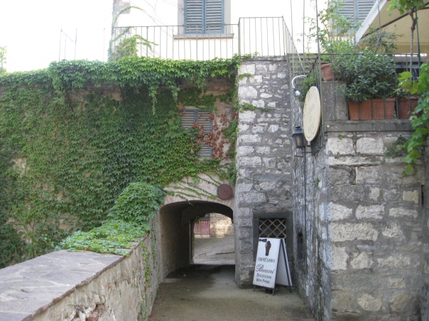 looks like something from the french quarter in New Orleans. Stone walls with buildings above, a sign advertising something pointing to a short tunnel. Plants growing up the walls.