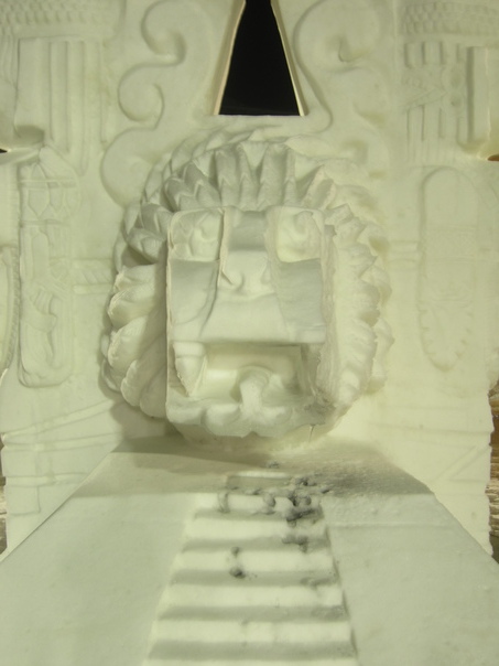 There is white carvings of a sculpture of the face of a king.