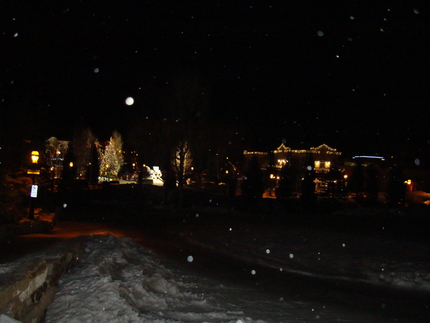 Christmas eve snowflakes gently dancing on the town's holiday illuminated houses.