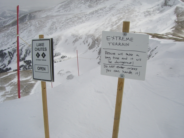 This is a picture of signs on a snowy mountain warning travelers to be careful.