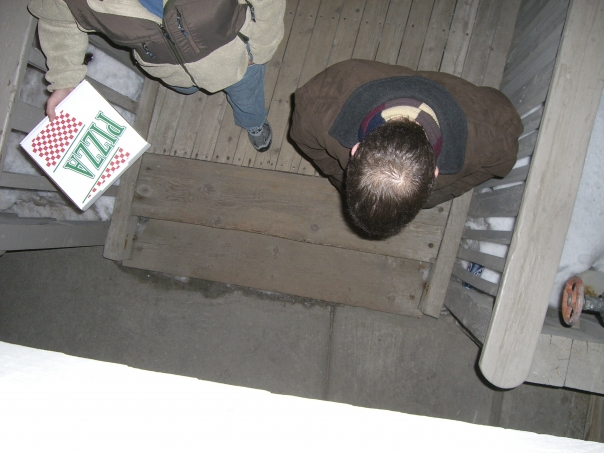 Like a ravenous hawk, we perched, eagerly awaiting the pizza delivery!