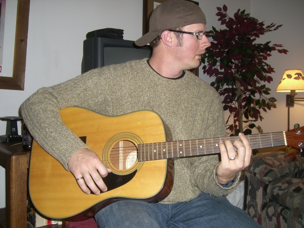 A Man playing a guitar inside a room, sitting in front of a TV and a sofa lying beside. There is a small bush in the corner and a corner lamp.