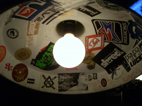 A light fixture that is lit up and is decorated with many stickers.