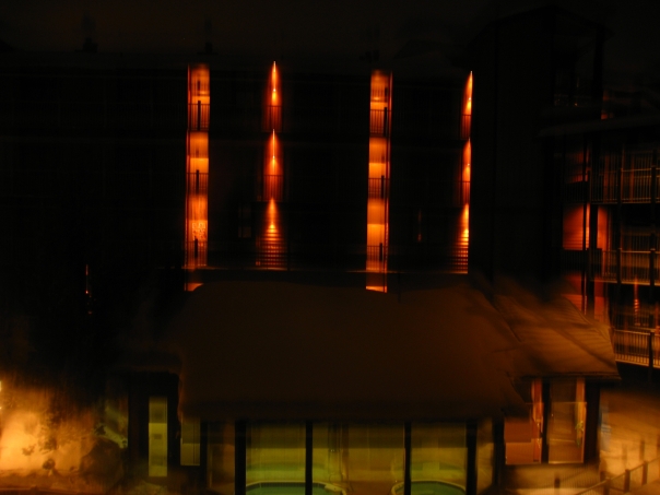 The orange glow of the apartment complex porch lights makes for an interesting architectural picture.