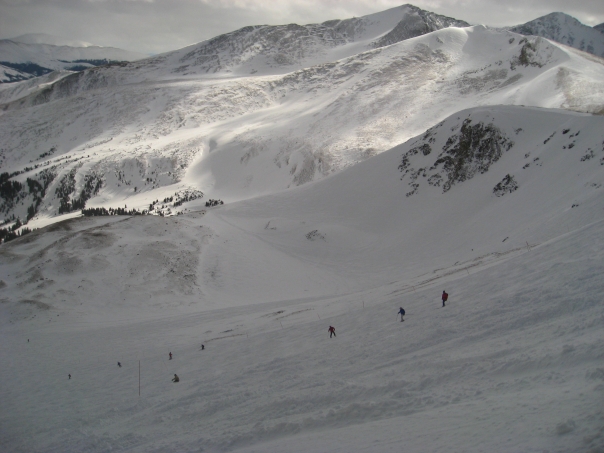 Relative to the enormous snow-covered mountain slopes, these athletic skiers look positively miniscule.