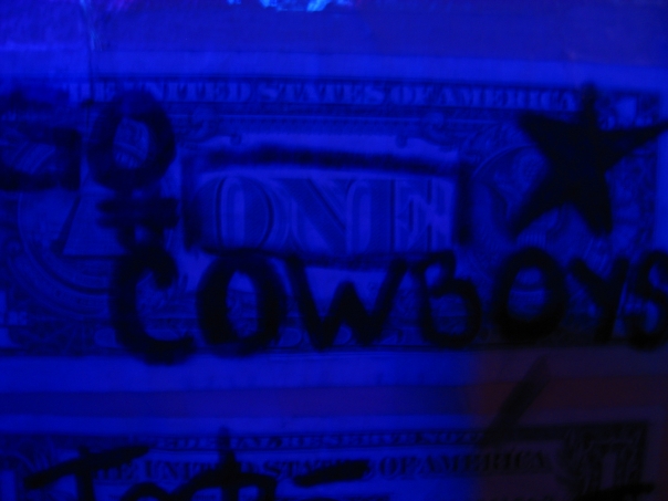 Bright blue light shining on a sheet of plastic with a dollar bill behind it.