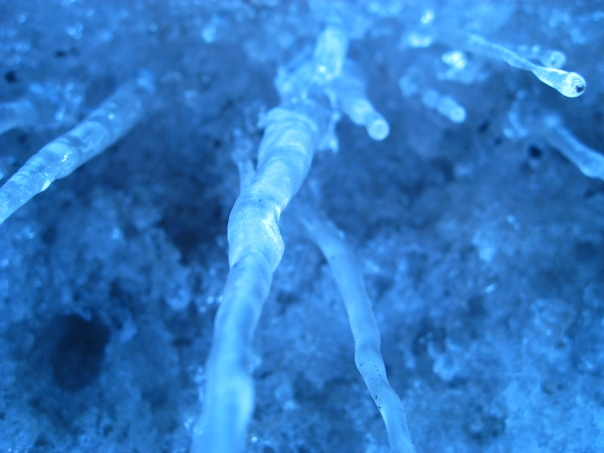 Long translucent icicles deep in a blue ice cave start to melt as spring nears.