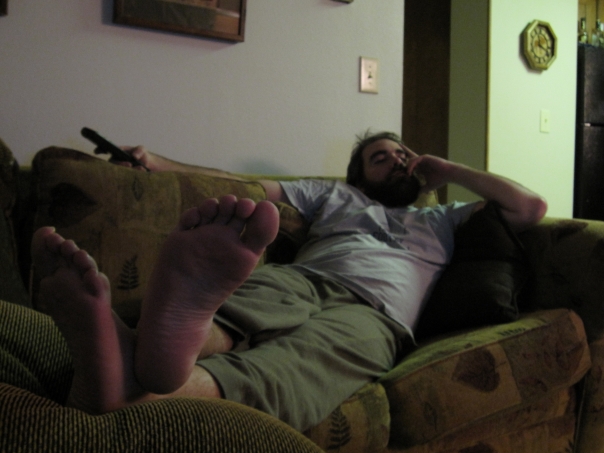This man naps as he reclines on a patterned couch after watching TV.