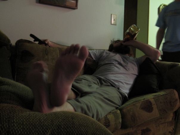There is a young, bearded man on a brown couch chugging liquor in a dimly lit room.