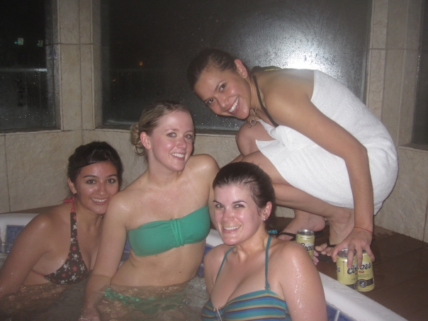 Four best friends enjoying an exciting night of hot tubs and drinks.