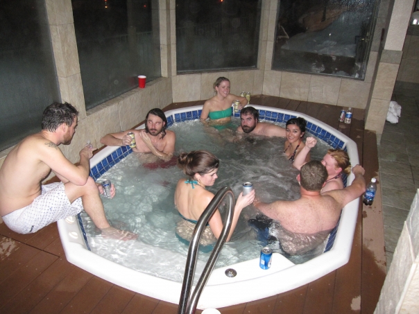 Male and females inside a hot tub drinking and talking.
