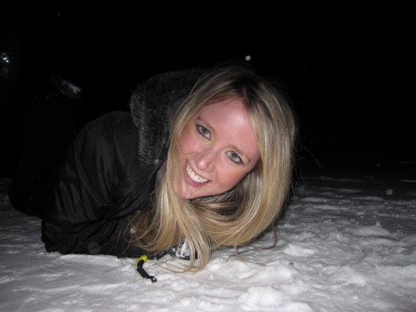 The tipsy blonde fell in the snow, she should go back inside it's much to dangerous for her.