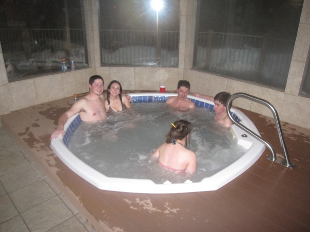 These people are enjoying themselves in an indoor hot tub, away from the snow covered landscape outside.
