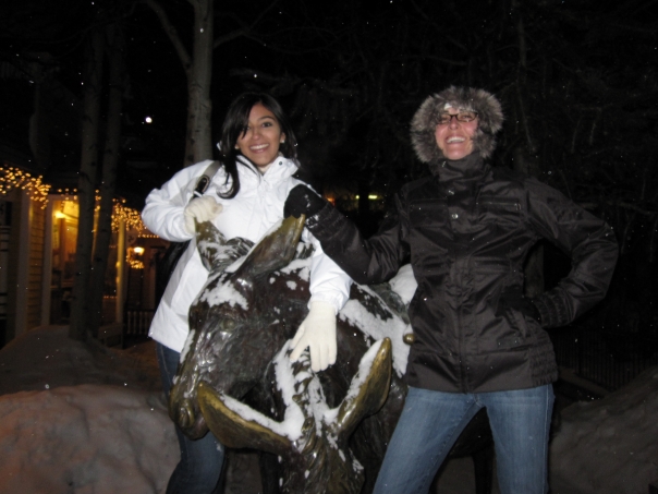These women are posing in front of a donkey statue on a cold, snowy night.