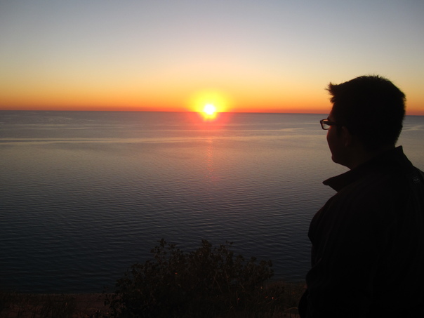 A young man wearing glasses stands overlooking calm water and a pretty sunset in the distance. |