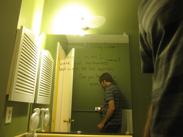 Just a bunch of photos I took around my house one afternoon. Besides the delightful message that Caroline left on my mirror, I also had the pleasure of coming across a full snail orgy. Super NSFW!