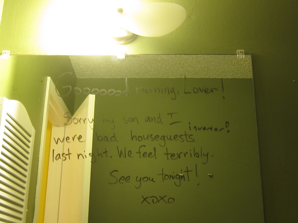 Just a bunch of photos I took around my house one afternoon. Besides the delightful message that Caroline left on my mirror, I also had the pleasure of coming across a full snail orgy. Super NSFW!
