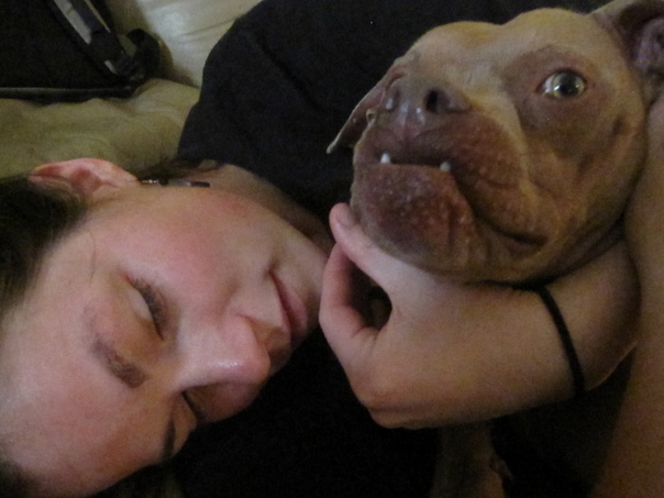 Fair complected woman in black top is gently hugging her pit bull breed dog with an under bite while he watches the person with the camera.