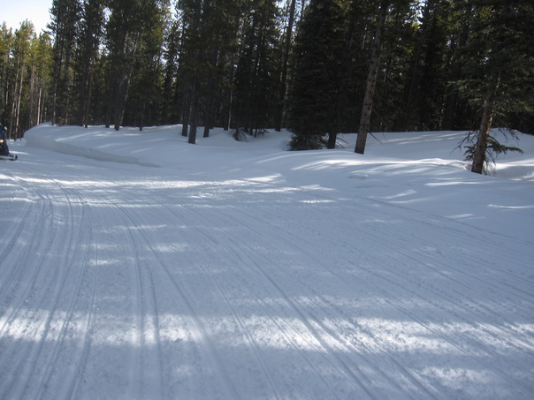 Freshly groomed powder snow in the forest on a sunny day.