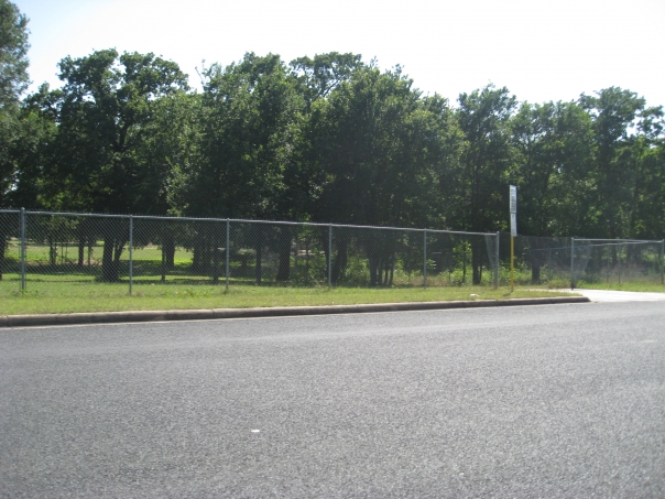 A paved area that is surrounded by a chain link fence, with trees visible in the distance.