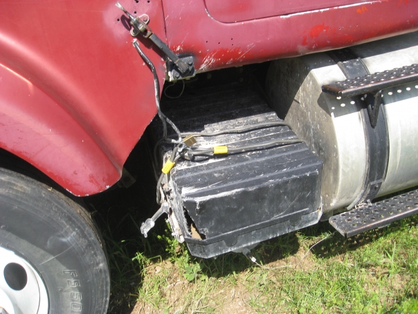 A damaged black box attached to the underside of a truck.