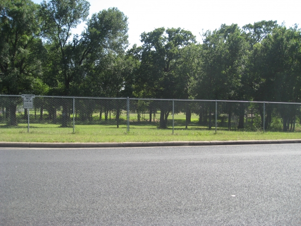 The trees that are green in color are surrounded by a metal fence.