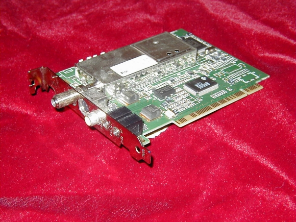 A green circuit board, no wires attached, laid on a red piece of fabric, close up.