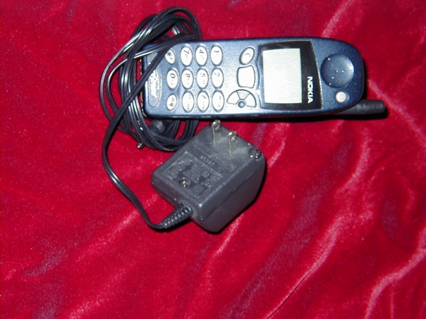 A cellphone and a charger laying on a red sheet.