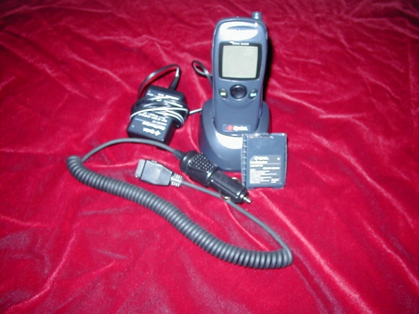 cell phone and accessories---battery, charger, and car charger, on red velvet