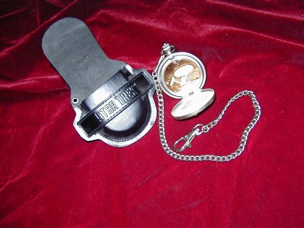Memorative Enterprise pocket watch with an embosed leather case reading Star Trek