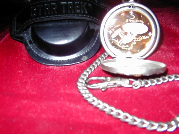 we can see the locket and hat on the red cloth of the table