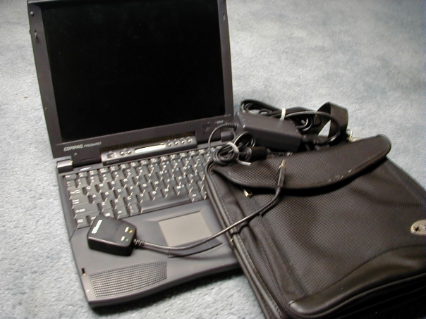 An open Compaq laptop with cables and carry bag on top of it