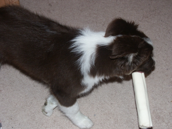 A small black and white puppy trots along with a bone in its mouth.