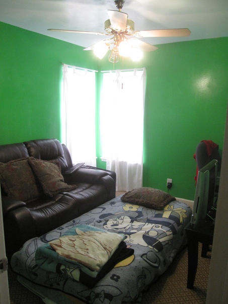 The room has green walls, a brown leather couch, and a mattress with a Disney blanket on it.