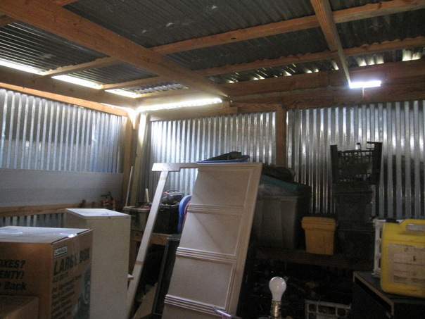 A cluttered storage unit with boxes, totes, shelves and a white head board.