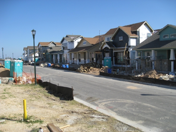 This is a picure of a new subdivision. The houses are very close together and there doesn't look to be much of a yard. The outhouses across the street and debris point to this being in the process of construction.