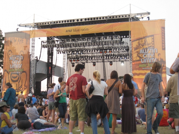 People are hanging out and milling around on the lawn of an Austin City Limits concert.