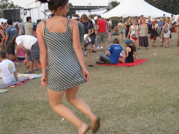 Young woman wearing short striped dress dancing on grass while spectators watch.