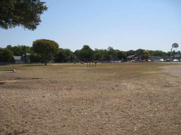 A large and empty dirt lot with a playground and residential area far away in the background.