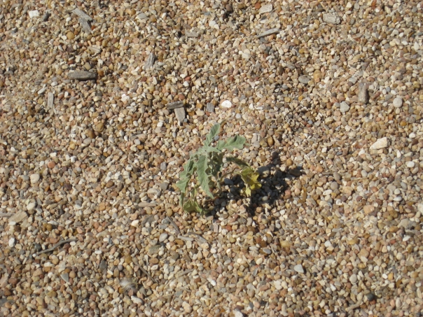 The single green plant grows in the multi colored pebbles.