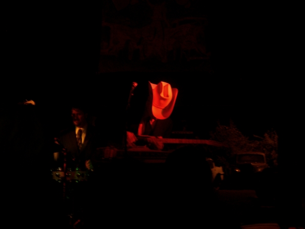 A man in a cowboy hat plays guitar, tinted red from the stage lights.