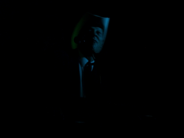 It appears as though a picture of a television screen shot, a man in a cowboy hat smiles oddly in the dim light.