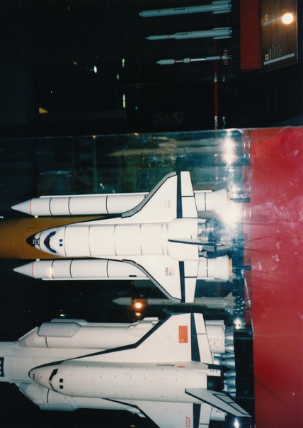 Two scale models of NASA shuttlecrafts and rockets are displayed.
