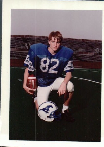 A football player with the number 82 jersey is kneeling on the football field having his picture taken.