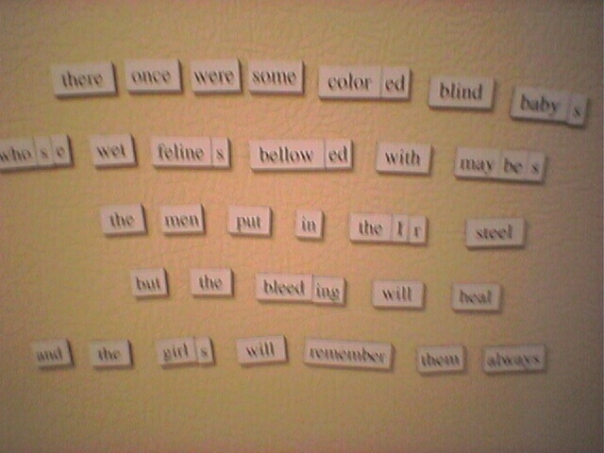 Magnet words made up into a run-on sentence or perhaps free form poem are stuck to an off-white surface.