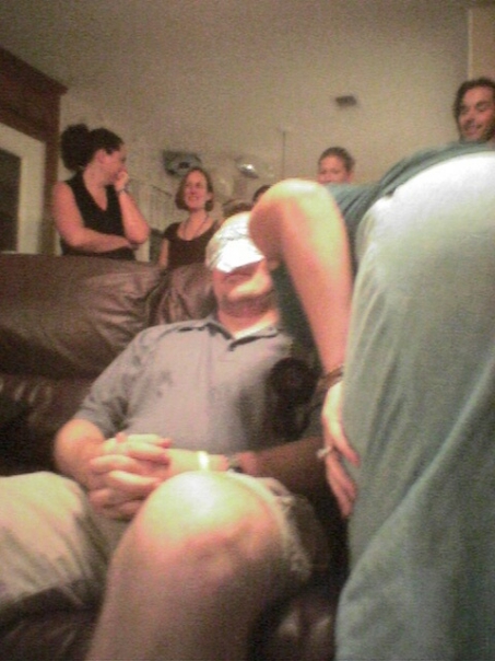 Friends trying to pull a joke on one of their friends, blind folding him .