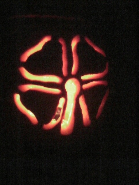 an odd picture of some sort of orange symbol surrounded by black shadows.