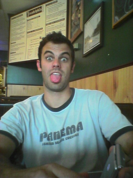 A male in a ringer t-shirt sits at a restaurant, sticking his tongue out.