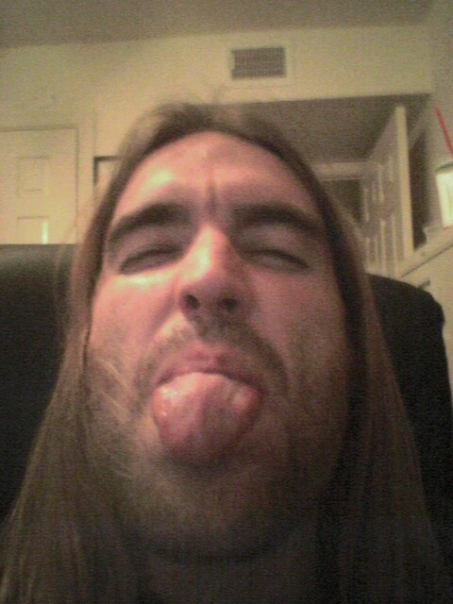 A man with long sandy blond hair is sitting against a black couch, closing his eyes and sticking out his tongue.